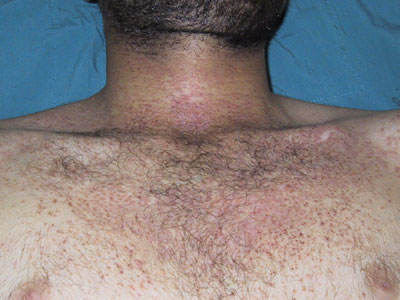 | Case 29: The Patient is a 23-yrs-old man with about 2 years history for multiple nodular lesions on his anterior trunk. Except occasional suppuration of some lesions, there was no complaints. His family history was negative for similar condition and otherwise he was in good health. A skin biopsy confirmed the diagnosis. What is your diagnosis? | ||