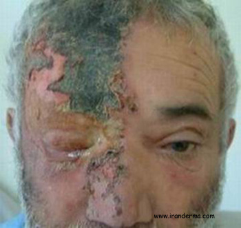 | Case 28: A 75 yrs-old man present with pain and paresthesia in the right side of his face. On physical examination, he had unilateral crusted plaque on the right side of frontal area with involvement of scalp and nose. What's your diagnosis? | ||