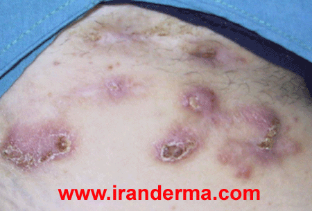 Dx: Scrofuloderma Scrofuloderma results from the involvement and breakdown of the skin overlying a tuberculous focus, usually a lymph gland but sometimes an infected bone or joint. The most common site is cervical region and less often the axillary, inguinal, epitrochlear and retro-auricular areas. Clinically the lesions first manifest as blue-red, painless swellings overlying the infected glands and then break down to form undermined irregular ulcers in association with fistula formation. After healing, characteristic puckered scarring marks the site of the infection |
