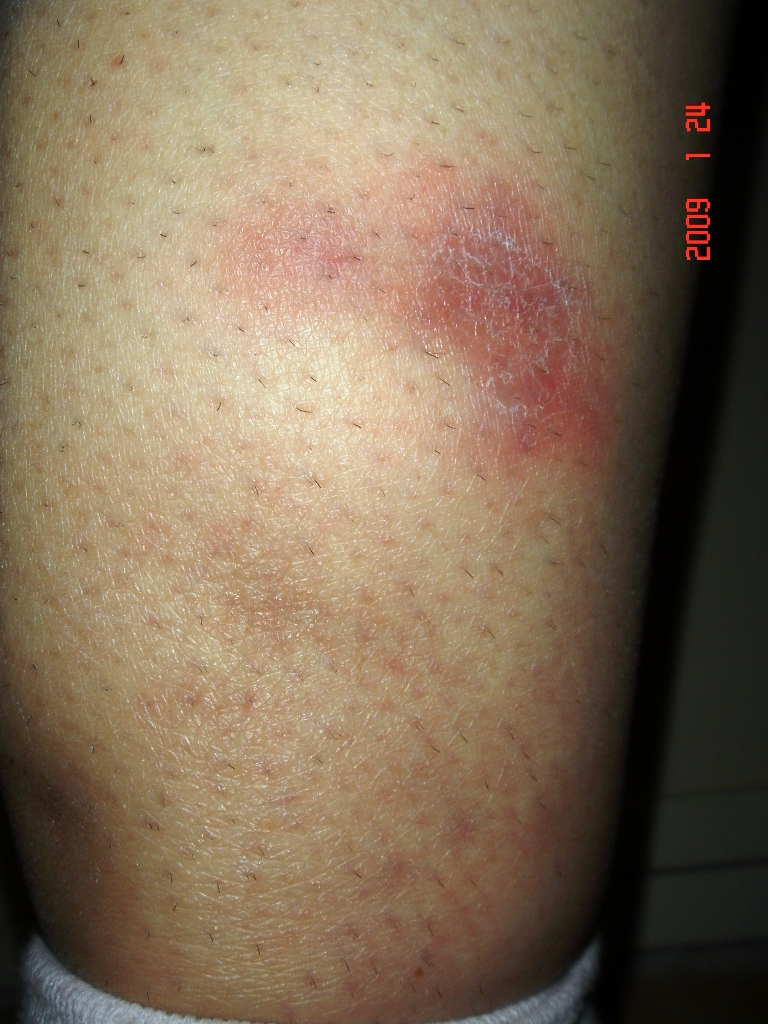 | Diagnosis: Erythema Induratum Erythema induratum usually presents with recurring, tender, painful nodules on the calves, which often ulcerate and heal with scarring. It is much more common in females than in males. Bazin gave the name erythema induraturn to this disease when histologic examination revealed caseation necrosis and the lesions were associated with tuberculosis. It has been regarded as a manifestation of tuberculin hypersensitivity, a type of tuberculid occurring on the legs, whereas nodular vasculitis represents the nontuberculous counterpart. The number of reports of erythema induratum of Bazin is decreasing in most developed countries in accordance with the decreased incidence of tuberculosis. Most authors